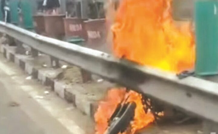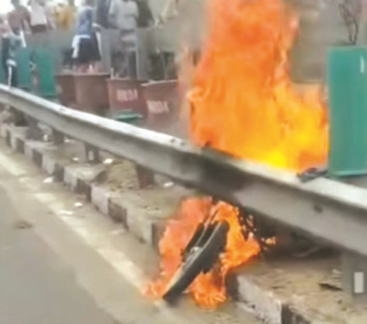 घटना गुरुकुल कांगड़ी फ्लाईओवर के ऊपर की है। यहंा बाइक में आग लगने के कारण ट्रैफिक जाम हो गया। कांवड़ मेले का आज अंतिम दिन है। बुधवार को सभी कांवडियों को अपने-अपने गंतव्य पर पहुंचकर जल चढ़ाना है। ऐसे में हरिद्वार में कांवडियों का जनसैलाब देखने को मिल रहा है।