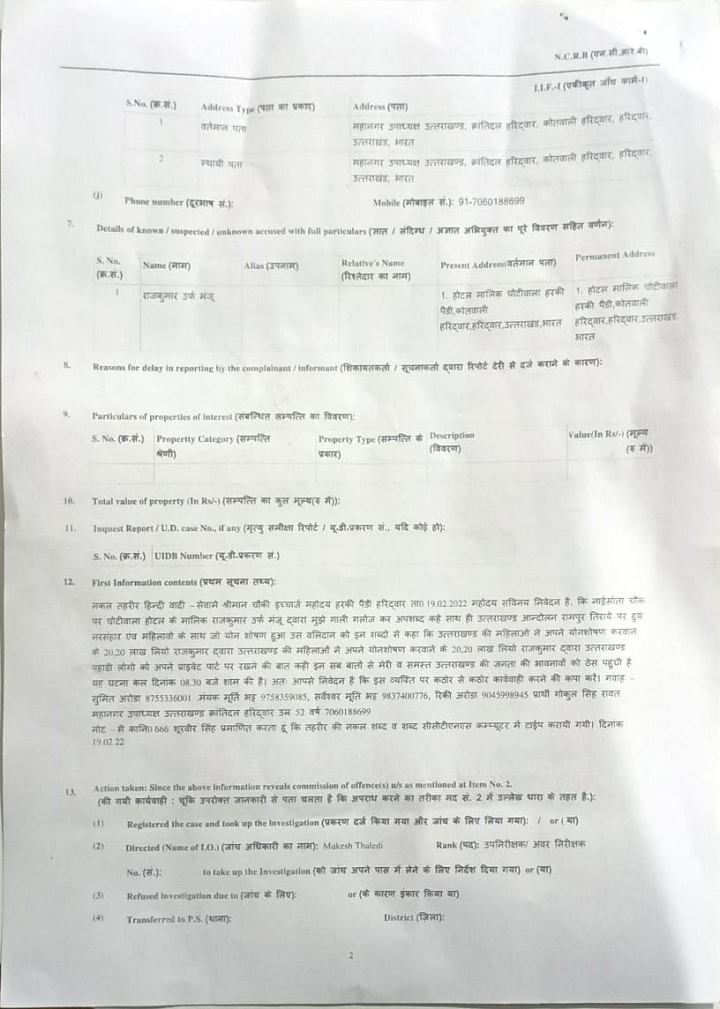 धर्मनगरी हरिद्वार में एक होटल मालिक पर सार्वजनिक रूप से उत्तराखण्ड की महिलाओं के लिए अत्यंत अश्लील और आपत्तिजनक टिप्पणी करने पर कोतवाली में मुकदमा दर्ज कराया गया है। उक्रांद के महानगर उपाध्यक्ष गोकुल सिंह रावत की ओर से दर्ज करायी गयी एफआईआर में राजकुमार उर्फ मंजू पर उत्तराखण्ड की महिलाओं के लिये अत्यंत अश्लील और आपत्तिजनक टिप्पणी करने के गंभीर आरोप लगाये गये हैं।