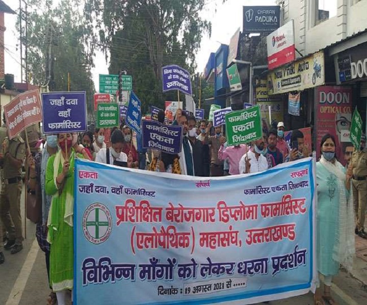 राजधानी देहरादून में अपनी नियुक्ति की मांग को लेकर सचिवालय कूच कर रहे बेरोजगार फार्मासिस्ट और पुलिस के बीच तीखी नोकझोंक के बाद पुलिस से दो सौ से अधिक फार्मासिस्टों को गिरफ्तार कर दिया। पिछले कई दिनों से से बेरोजगार प्रशिक्षित फार्मासिस्ट (एलोपेथिक) महासंघ से जुड़े हजारों फार्मासिस्ट आंदोलनरत हैं। देहरादून के एकता विहार सहस्त्रधारा रोड स्थित धरनास्थल पर धरना.प्रदर्शन कर रहे हैं। सोमवार के सचिवालय कूच करने पर पुलिस ने सुभाष रोड पर बैरियर लगाकर उन्हें रोक लिया। प्रदर्शनकारी वहीं सड़क पर धरने पर बैठ गए। सुभाष रोड समेत आसपास के मार्गों पर देर तक जाम लगने से लोगों की परेशानी और फार्मासिस्ट के बढ़ते विरोध को देखते हुए पुलिस ने उन्हें हिरासत में ले लिया। देर शाम पुलिस लाइन से उन्हें छोड़ दिया गया।